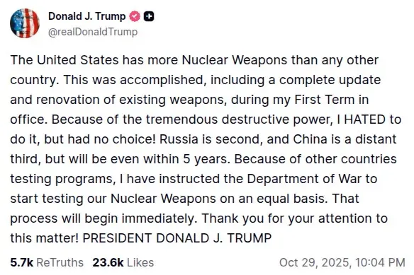 No obstante, Trump afirmó en su cuenta de Truth Social que «debido a los programas de pruebas de otros países, he dado instrucciones al Departamento de Guerra -nombre con el que el Gobierno estadounidense identifica al Pentágono- para que comience a probar nuestras armas nucleares en igualdad de condiciones», e indicó que «ese proceso comenzará de inmediato«.